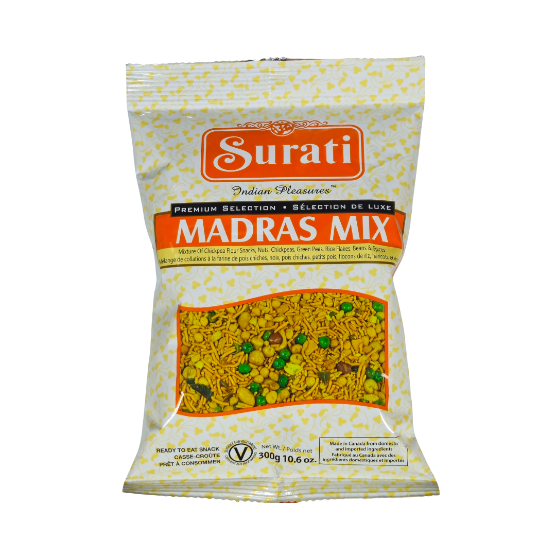 "Indulge in the traditional taste of Surati with our Madras Mix. Made with a blend of authentic spices, this snack offers a savory and spicy flavor that is sure to please your taste buds. Enjoy the perfect mix of crunch and spice with every bite!"